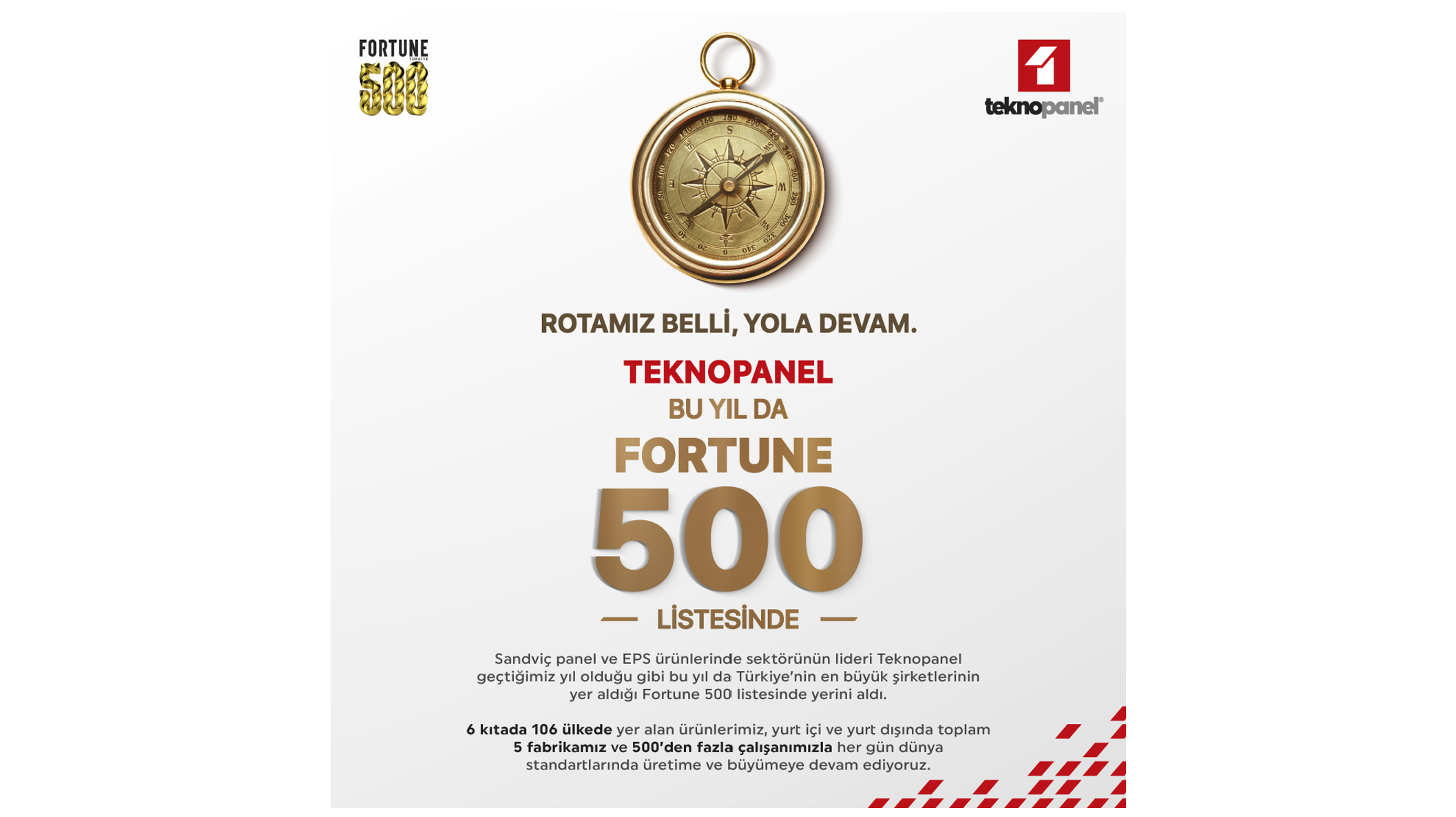 Sandviç panel ve EPS ürünlerinde sektörünün lideri Teknopanel, geçtiğimiz yıl olduğu gibi bu yıl da Türkiye’nin en büyük şirketlerinin yer aldığı Fortune 500 listesinde yerini aldı.